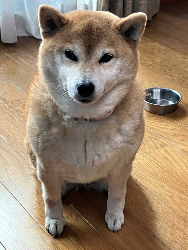 散歩から帰って朝食を食べ終わった状態です。後少し食べたそうな感じですが