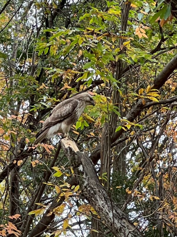 ノスリというおとなしい鷹の一種だそうです、5~6メートル先の枯れ木の先端にたたずんで居ました。